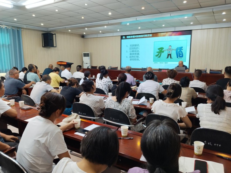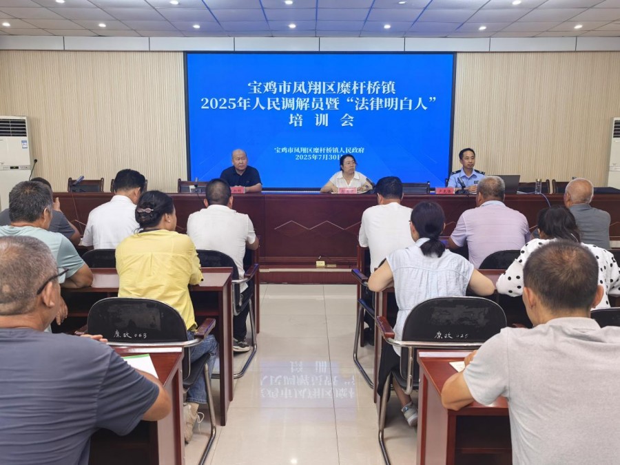 7月30日,糜杆桥镇组织开展了2025年人民调解员和“法律明白人”培训会。镇村两级人民调解员、“法律明白人”及“巾帼民情员”共计60余人参加了培训。镇“法律诊室”副主任、司法所所长卢虎强和凤翔区148法律服务所专职法律工作者、驻镇“法律诊室”法律咨询专家郁红科,分别为培训人员作了专题业务知识培训。镇党委副书记、政法委员、镇“法律诊室”主任张惠芝主持了培训会。