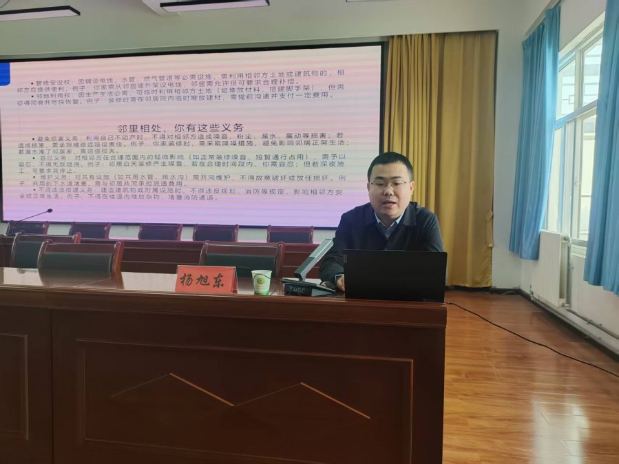 会议邀请镇法律顾问、常驻镇“法律诊室”法学咨询专家、陕西秦锦律师事务所律师杨旭东进行授课。培训紧扣基层治理核心需求,坚持“缺什么就补什么、弱什么就强什么”的原则,对于日常工作中经常遇到的法律问题,杨律师围绕邻里权利义务、农村自建房施工资质与房主审慎义务、相邻关系中的赔偿责任认定等常见纠纷问题,结合法律条文,把“法言法语”转化为“家常话”,让法律知识变得接地气、易理解、可运用。并系统介绍了“听、辨、劝、借、让、和”六字调解法。