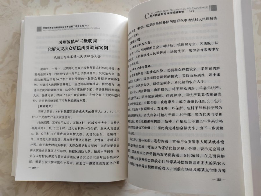 该书系统总结了宝鸡市调解工作的创新实践和宝贵经验,共征集遴选汇编了55起典型调解案例与20个优秀调解工作法。所辑录的内容是宝鸡市各级基层法律服务站点组织近期矛盾纠纷多元化解的实践探索形成的智慧结晶和生动写照。凤翔区共有4个典型调解案例和2个优秀调解工作法成功入选。