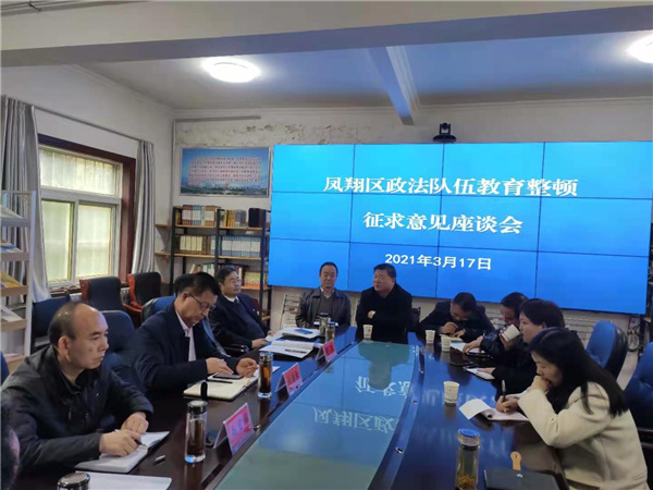 3月17日下午,凤翔区召开政法队伍教育整顿征求意见座谈会,广泛听取社会各界代表对全区政法工作和政法队伍的意见建议。区委常委、政法委书记、区政法队伍教育整顿领导小组副组长兼办公室主任刘关良主持会议,区政法各单位主要负责同志参加座谈会。
